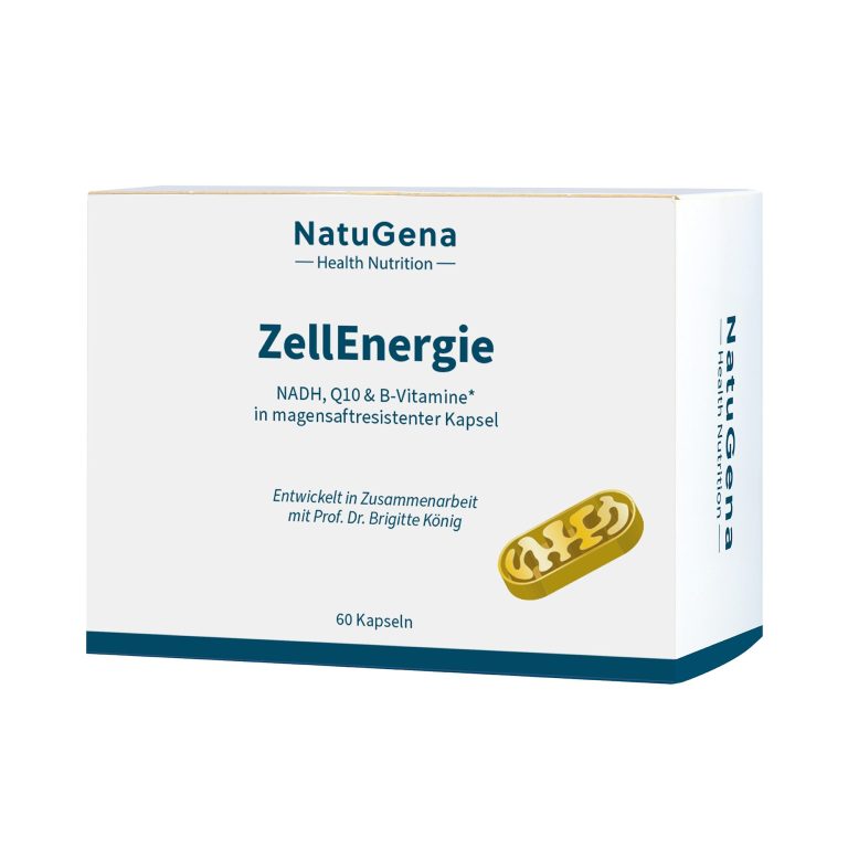 NatuGena ZellEnergie – Wertvolle bioaktive Vitamine, Spurenelemente und polyphenolhaltige Naturstoffe in einer einzigartigen Formel. Entwickelt in Zusammenarbeit mit Prof. Dr. rer. nat. Brigitte König. ZellEnergie bietet eine umfassende Versorgung mit essenziellen Nährstoffen mit nur einer Kapsel pro Tag. 60 Kapseln für eine 60-Tage-Versorgung. ZellEnergie enthält eine sorgfältige Auswahl an Vitaminen und Mineralstoffen, die den Körper in seiner Funktion unterstützen Vitamin B2 (Riboflavin-5-Phosphat) trägt als Antioxidant zum Schutz des gesamten Organismus bei.