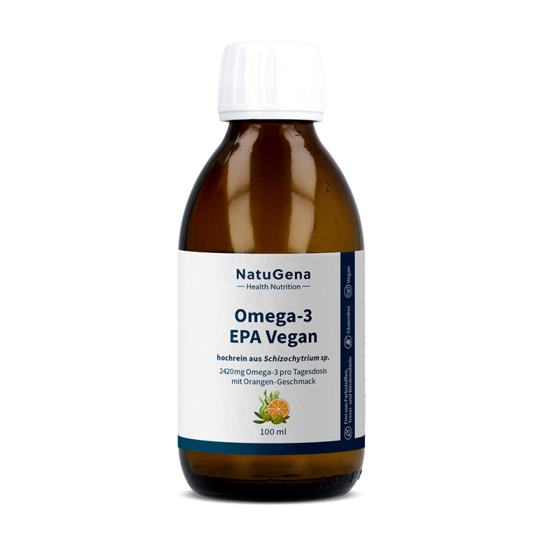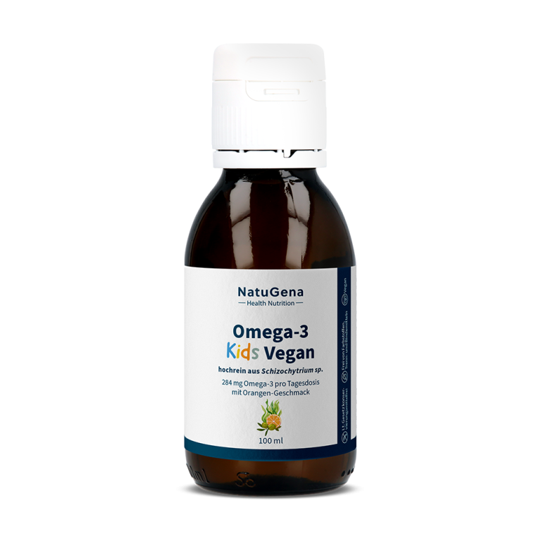 NatuGena Omega‑3 Kids Vegan – Pflanzliches Algenöl mit Vitamin D für Kinder ab 4 Jahren. Es liefert 284 mg pflanzliches Omega‑3‑Fettsäuren aus Algenöl und zusätzlich Vitamin D. Die mild‑fruchtige Orange‑Geschmacksnote und die Dosierkappe sind ideal für die tägliche Familienroutine. 100 ml für eine 40-Tage-Versorgung. In den ersten Lebensjahren entwickelt sich vieles rasant, gerade das Gehirn und die Augen machen große Schritte. Deshalb spielt DHA bereits ab dem Kindesalter eine bedeutende Rolle. Sie ist eine wichtige Omega-3-Fettsäure, die zur Erhaltung der normalen Gehirnfunktion und Sehkraft beitragen können. Da der Körper nur sehr geringe Mengen selbst bilden kann, empfiehlt sich eine regelmäßige Zufuhr über die Ernährung.